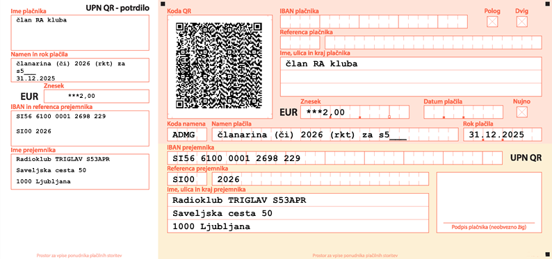 - Namen: Članarina 2026 RKT in klicni znak, oz. klicni znaki, za katere plačujete članarino. Če plačujete poleg klubske članarine tudi kotizacijo ZRS, navedite: Članarina 2026 RKT in ZRS ter klicni znak